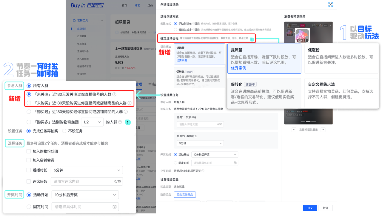 拉新时锁定 “未关注 / 未购买” 人群,避免福利被老客重复领取,降低拉新成本。平台建议可以福袋发放试用装、红包等,降低决策门槛,配合 “评论 + 看播时长” 任务,强化商品认知,促进首单。